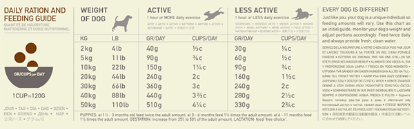 Fresh ranch-raised beef (8%), raw grass-fed lamb (7%), fresh yorkshire pork (7%), beef meat meal (7%), lamb meat meal (7%), pork meat meal (7%), whole green peas, whole red lentils, whole chickpeas, beef fat (5%), fresh beef liver (4%), fresh pork liver (4%), fresh bison (4%), fresh wild-caught walleye (4%), whole green lentils, whole pinto beans, whole yellow peas, sun-cured alfalfa, fresh beef kidney (2%), pollock oil (2%), lentil fibre, dried beef cartilage (1%), raw lamb tripe (1%), dried brown kelp, fresh pumpkin, fresh butternut squash, fresh parsnips, fresh green kale, fresh spinach, fresh mustard greens, fresh turnip greens, fresh carrots, fresh apples, fresh pears, freeze-dried liver (beef, lamb, pork) (0.1%), fresh cranberries, fresh blueberries, chicory root, turmeric root, milk thistle, burdock root, lavender, marshmallow root, rosehips. ADDITIVES (per kg): Technological additives: tocopherol-rich extract of natural origin. Nutritional additives: Vitamin E: 100IU, zinc chelate of amino acids hydrate: 100 mg, copper chelate of amino acids hydrate: 10 mg, taurine: 500 mg. Zootechnical additives: Enterococcus faecium NCIMB10415: 600×10^6 CFU.